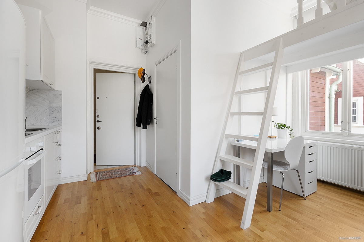 Lägenheten är i mycket gott skick och har en enkel, stilren karaktär där material och ljus får tala för sig själva. Sovloftet ger plats för en avskild sovdel samtidigt som rummet nedanför rymmer både soffhörna och matplats.